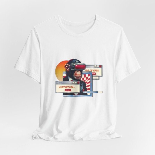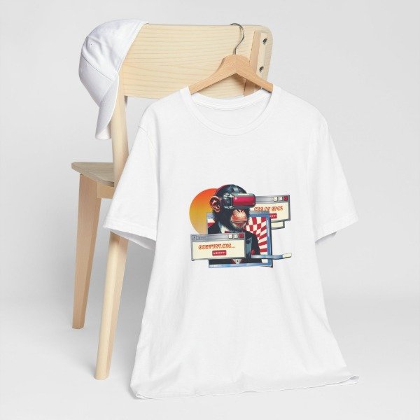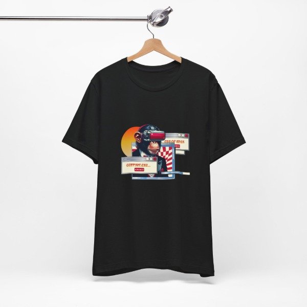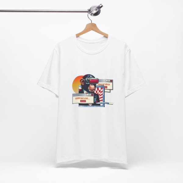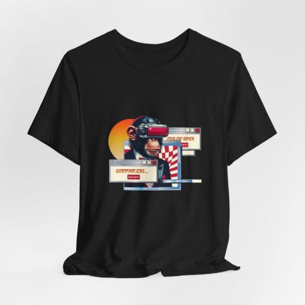 Remera unisex con diseño ilustrado de estética retro futurista. La gráfica combina un mono con visor de realidad virtual y ventanas de interfaz estilo vintage, creando un collage que fusiona tecnología, nostalgia digital y cultura pop. Un guiño visual a la evolución humana, los errores del sistema y la era de las pantallas.
