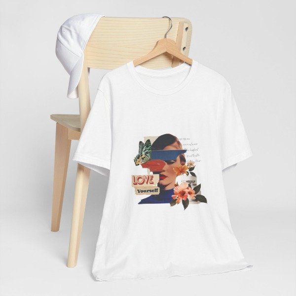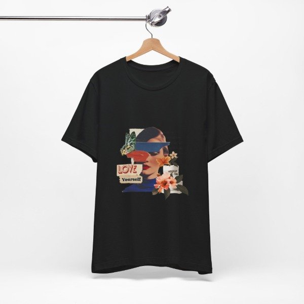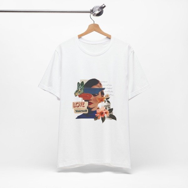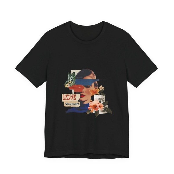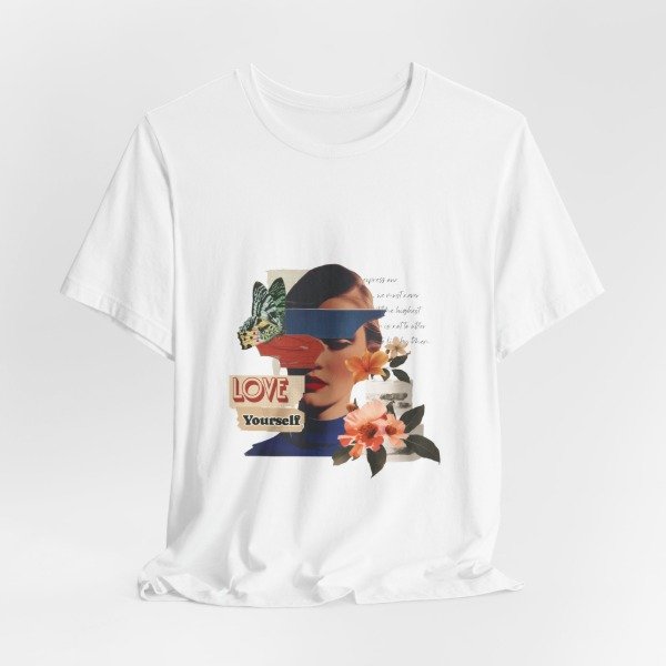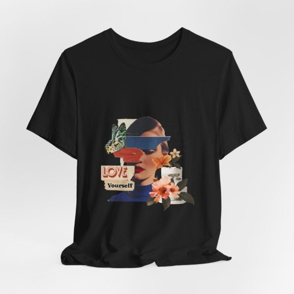 Remera unisex de diseño exclusivo que forma parte de una serie limitada de seis piezas Retro Collage. La ilustración combina un retrato de estética vintage con recortes gráficos y tipografía retro, creando una composición artística cargada de mensaje y sensibilidad. Su estilo collage remite a lo analógico y lo editorial, con una paleta equilibrada que destaca tanto en fondo blanco como negro.