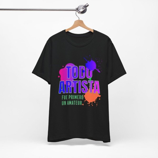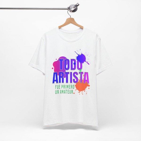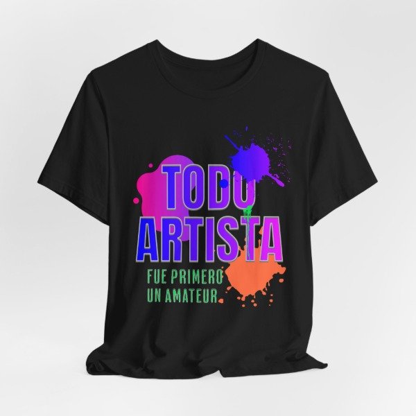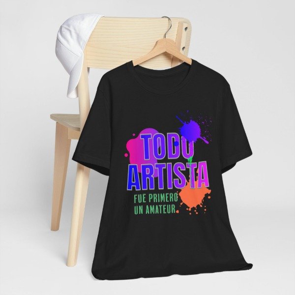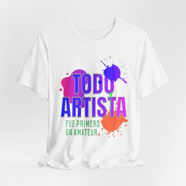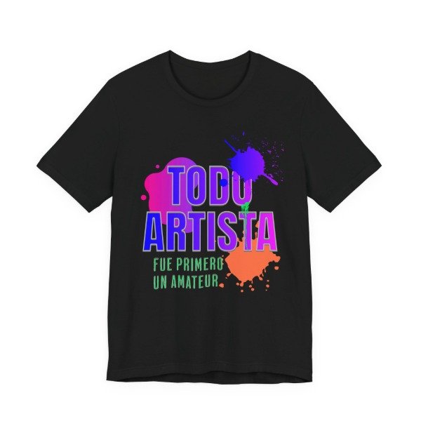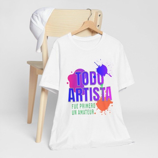 Remera unisex con diseño tipográfico y artístico que celebra el proceso creativo. La frase “Todo artista fue primero un amateur” se presenta en letras impactantes acompañadas de salpicaduras de color vibrantes, evocando pintura en movimiento, expresión libre y pasión por el arte.