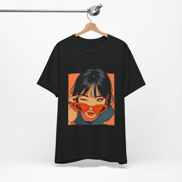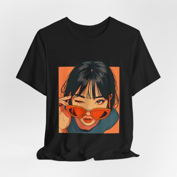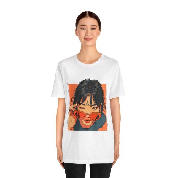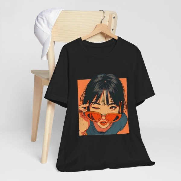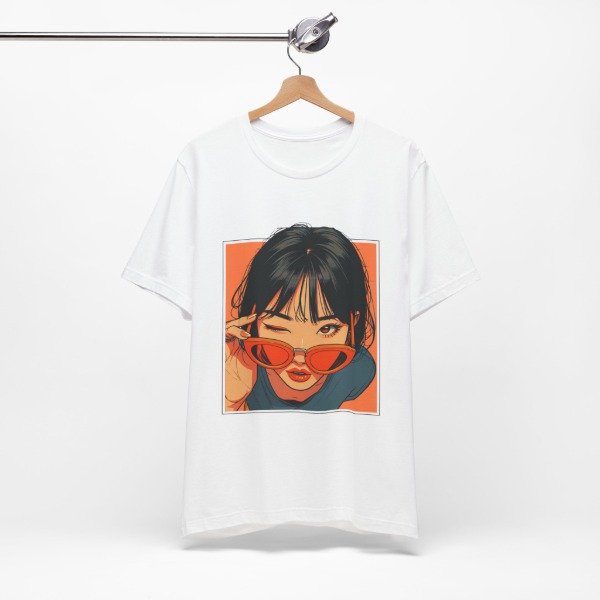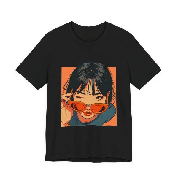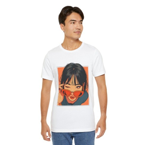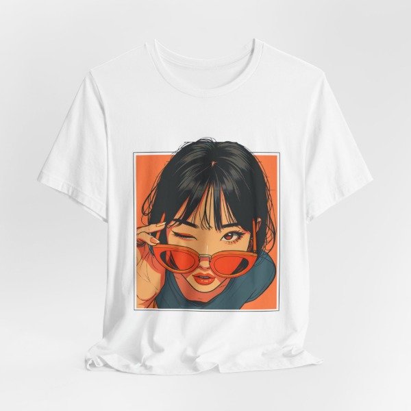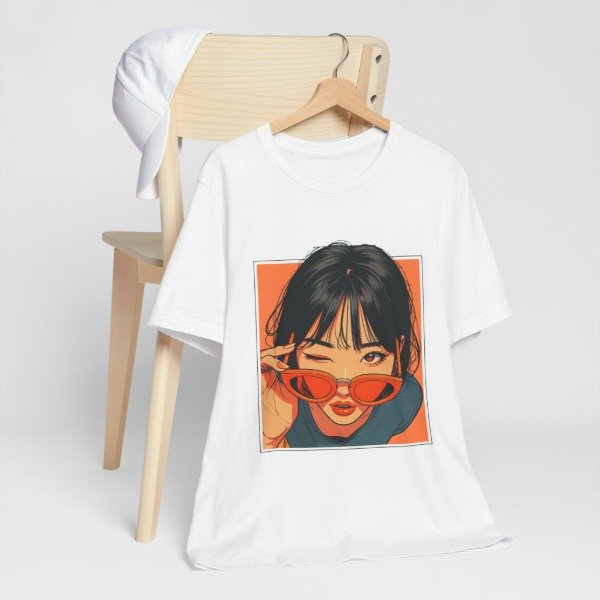 Remera unisex de diseño exclusivo, con ilustración artística de estilo urbano y moderno. El gráfico presenta un retrato femenino con gafas de sol en tonos cálidos que aportan personalidad, estilo y un look actual ideal para quienes buscan destacarse con una prenda original.