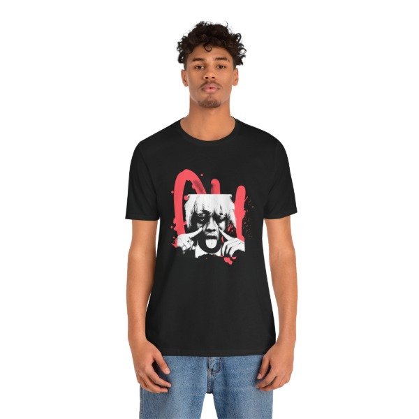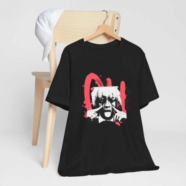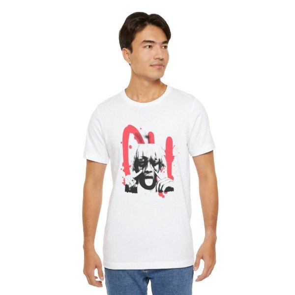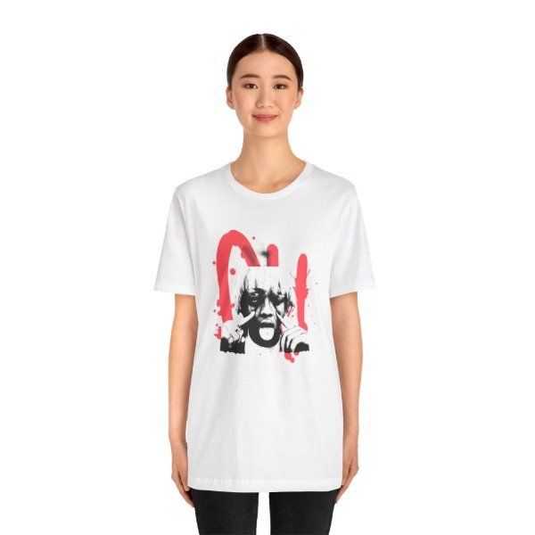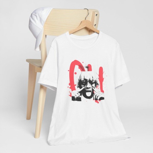 Remera unisex con diseño artístico de fuerte impacto visual. La ilustración combina un retrato en blanco y negro con trazos rojos tipo pincel y efecto splash, creando una estética urbana, provocadora y contemporánea. Un diseño que transmite actitud, rebeldía y libertad de expresión.