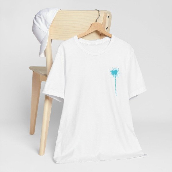 Remera unisex de diseño minimalista con un delicado splash de pintura en color celeste ubicado en el pecho. Un detalle sutil pero expresivo que aporta identidad artística sin perder limpieza visual. Ideal para quienes buscan una prenda simple, moderna y con un toque creativo.