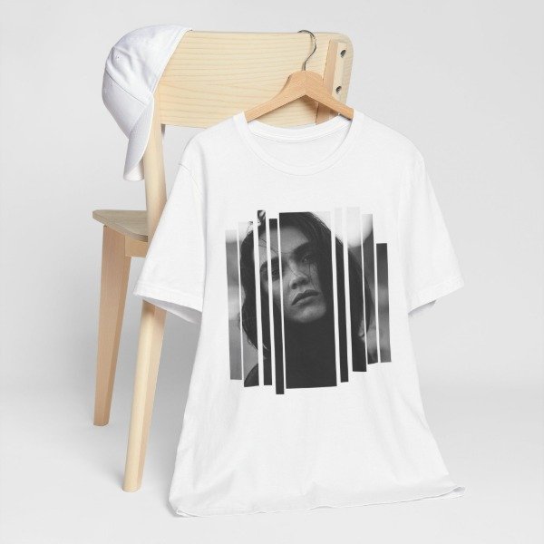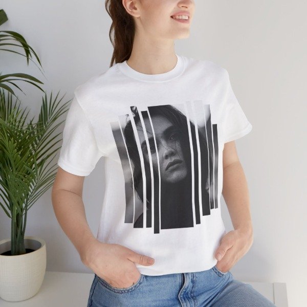 La imagen recortada genera un efecto visual impactante que llama la atención al instante. Es perfecta para un retrato individual, una sesión de fotos o esa imagen que cuenta mucho más de lo que muestra. No es solo una remera, es una declaración estética.